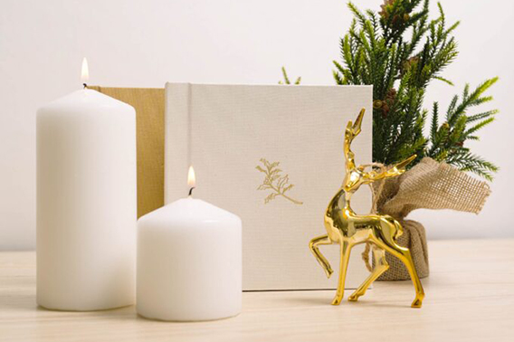 A 6″x6″ mini album decorated in an optional sparkling gold holly branch or Christmas tree imprint, with a choice of Pearl Snow or Sparkling Gold Buckram, or rich Emerald or Rouge French Velvet. The mini album consists of 5 spreads in a photographic Fuji Lustre paper, printed on a heavy page core, and includes a choice between 3 curated, holiday themed-endsheets. The mini album includes a small, gold holly branch imprint on the cover of the Buckram, or a small gold Christmas tree imprint on the cover of the French Velvet.