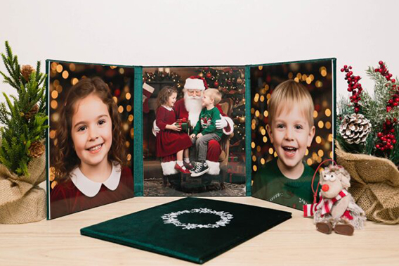 Created to embrace the glamour and beauty that accompanies holiday shoots, the Noel Folio is a special edition to our folio collection featuring an unmatted, 8″x10″ frame and a choice between a duo (2) or trio (3) option. The images are set in a glossy casting, and then wrapped in a choice between Pearl Snow or Sparkling Gold Buckram, or rich Emerald or Rouge French Velvet material. The cover of the folio includes a white imprint of a classic mistletoe, as well as a holiday quote Christmas tree pattern that is revealed when opening the first folio side.