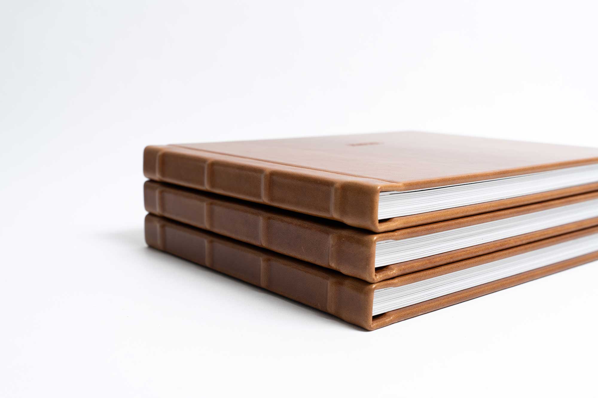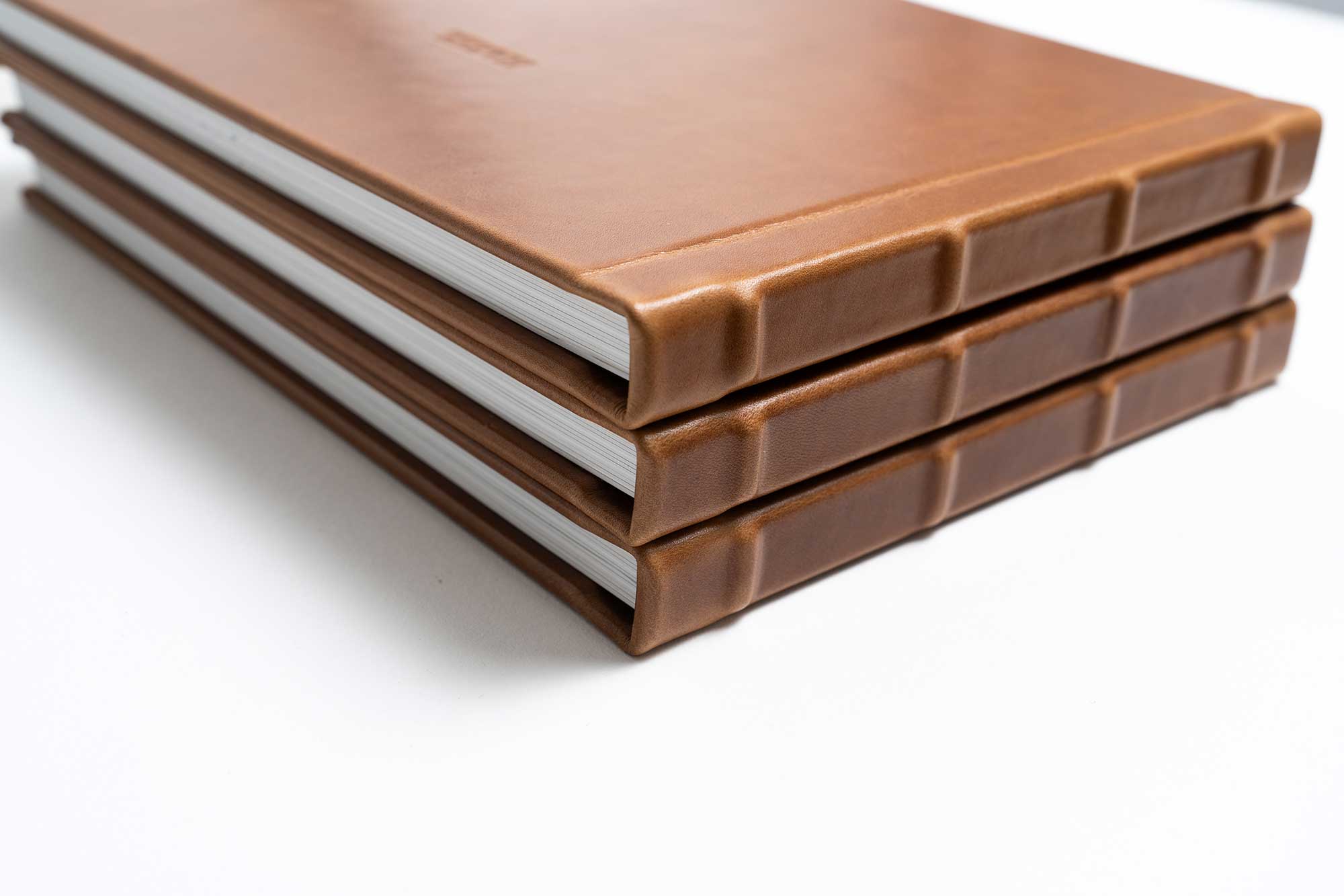 The ribbed spine option uses traditional bookbinding techniques to create raised ridges along the spine, dividing it into subtle segments. It adds structure and a more “bound book” feel without changing the clean look of the cover.