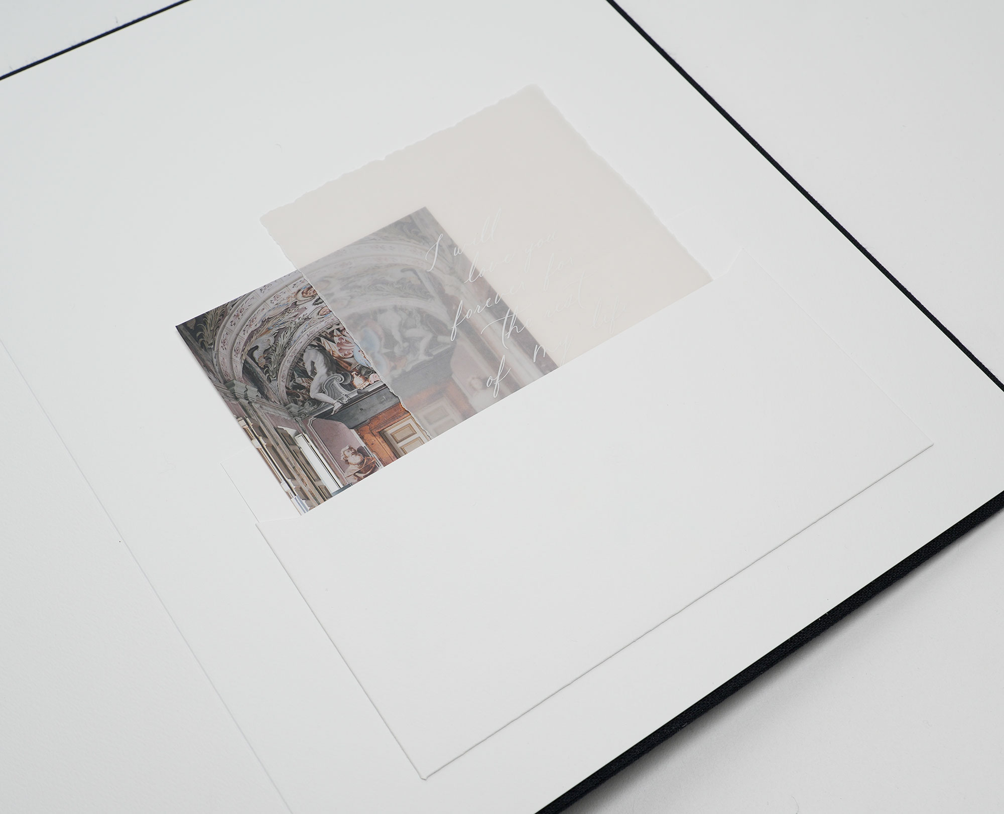 Use the pocket as a final touch to the story–an invitation, a vow card, or a favourite extra print can all become part of the closing moment of the album.