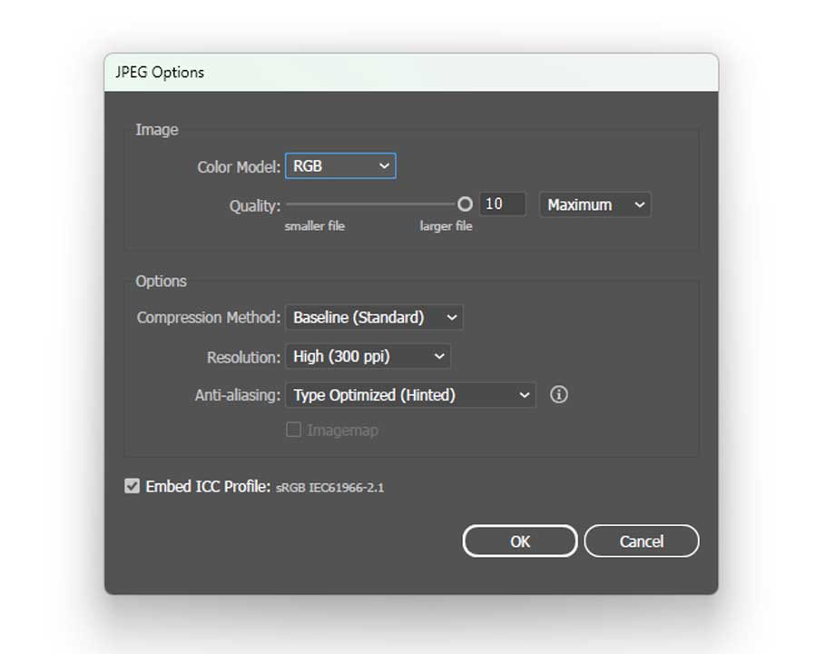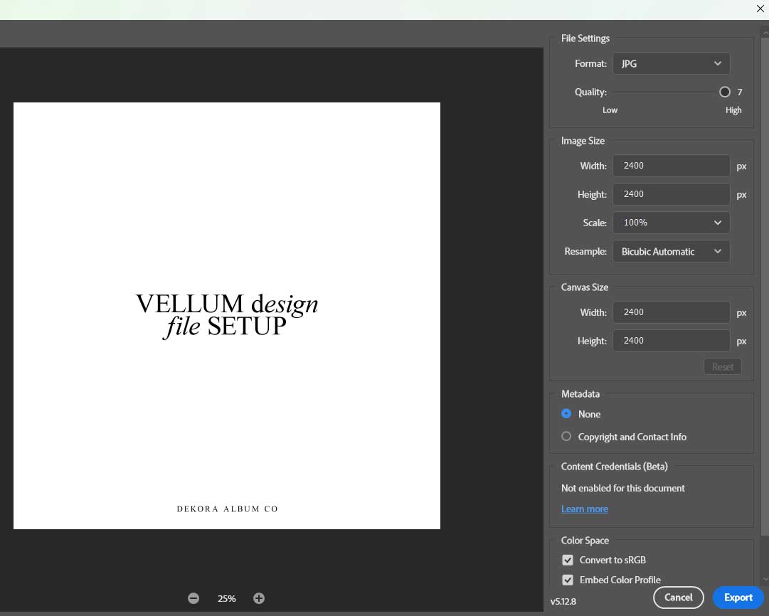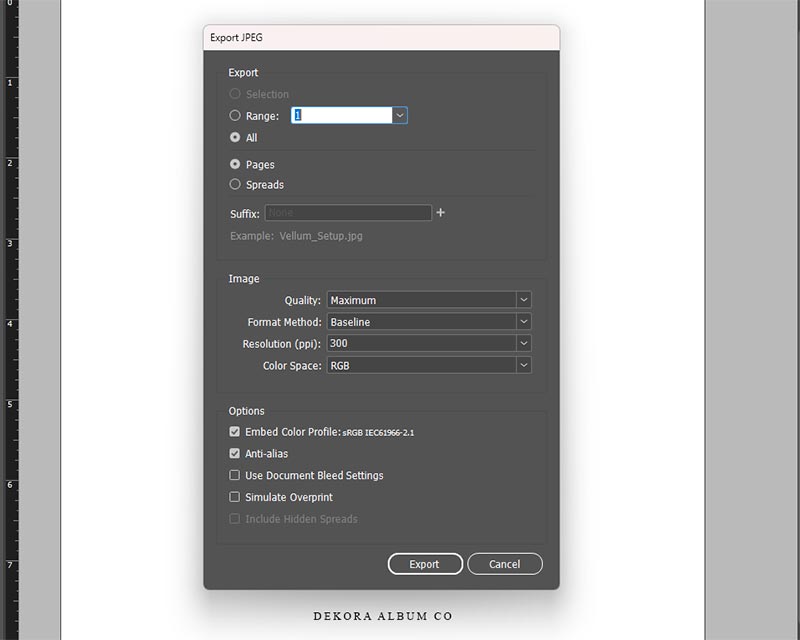 Create a single-page (½ spread) document in your chosen album size with a white background, set to sRGB at 300 PPI. Keep important text and artwork at least 0.4" from the edges, and remember that approximately 0.375" on the left side will be covered by the binding strip. Then save the file as a JPEG (sRGB, 300 PPI) and include it with your album files.
